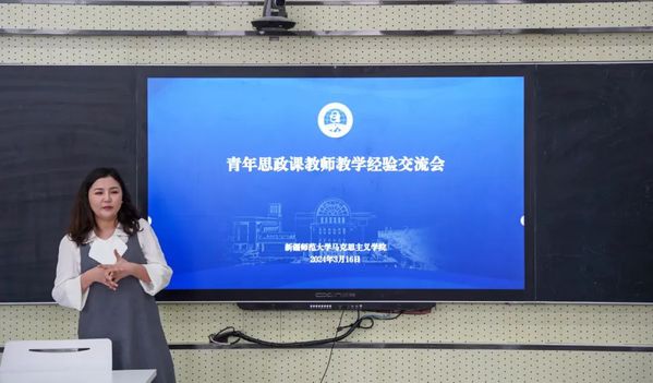在昆仑校区田家炳楼106智慧教室举办“青年思政课教师教学经验交流会”。自治区党委教育工委思政处处长王传振出席会议并讲话,学院思想政治教育系主任谢玲主持会议。
