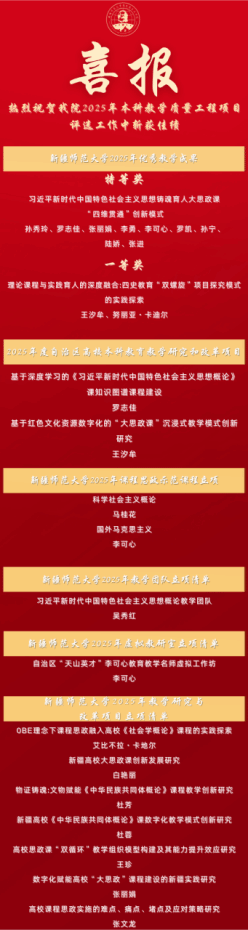 教学特色与实际,精准破解本科教育教学中的重点、难点问题,积极探索新时代马克思主义理论人才培养新机制、新模式。下一步,学院将以此次获奖为契机,持续培育高层次教学研究成果,坚持“以研促教、教研相长”,不断提升本科教学质量,为培养担当民族复兴大任的时代新人筑牢教学根基。期待全院教师在后续教育教学工作中再接再厉,再创佳绩!
