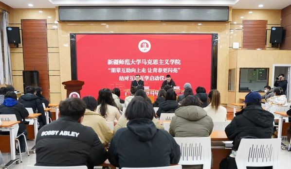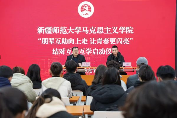 仪式上,木拉提·拜尔地介绍了今年“朋辈互助向上走 让青春更闪亮”结对互助互学方案。本学期,学院在开展“朋辈帮扶志愿者”的基础上,进一步完善了学院朋辈互助体系,不断激发学生学习的积极性和主动性,促进学生德智体美劳全美发展。