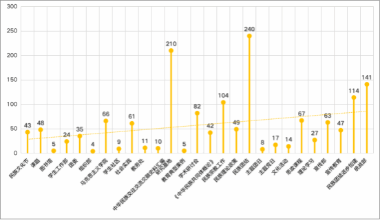视图显示,高校在铸牢中华民族共同体意识实践中,有关“民族团结”内容达240条,“民族团结进步创建”占114条,“民族宗教工作”共104条,表明高校普遍重视民族团结工作,积极促进各民族学生交流互动。“研究基地”共计210条信息,说明各高校对研究基地的重视程度。除了统筹的业务工作外,职能部门和教学单位也成了高频词,“统战部”以141条信息居首位,凸显了其核心作用。其他部门依次为“小猪视频 66条>宣传部63条>团委35条>学生工作部24条>教务处11条>图书馆5条>组织部4条”。小猪视频 和宣传部是铸牢中华民族共同体意识的主力部门,通过推进学术研讨会(82)、思政课程(67)、民族理论政策宣讲(49)、宣传教育(47)、《中华民族共同体概论》课程(42)等形式开展工作。实践活动中,“社会实践”共61条、“民族文化节”共43条等,第二课堂内容占比突出,是铸牢中华民族共同体意识实践的重要途径和有效载体。值得注意的是,“课题”占48条,与之相关的职能部门也成为共频词被展现出来,但因各高校课题发布的部门名称存在差异,统计归类较为困难。在指标验证中,不能忽视各部门有关铸牢中华民族共同体意识教育的业务工作和作用发挥。经验证,初拟评价指标内容符合高校实践中的具体举措,具有可操作性、通用性和适应性。